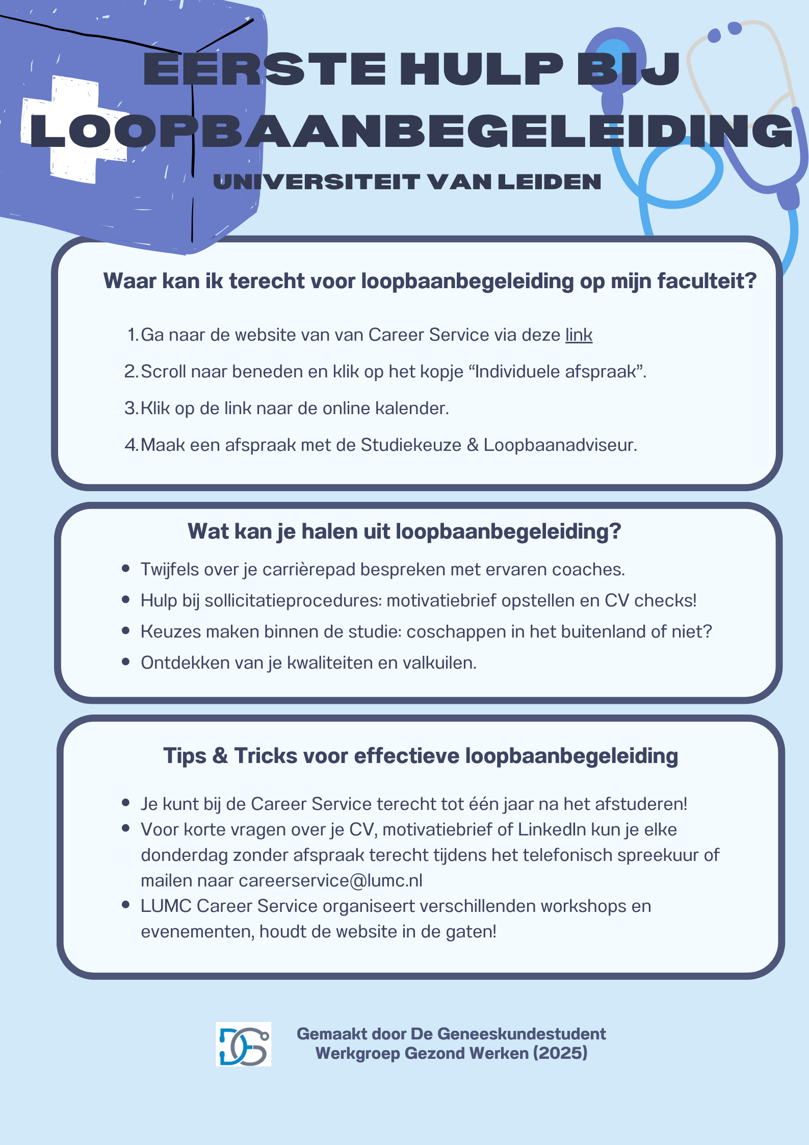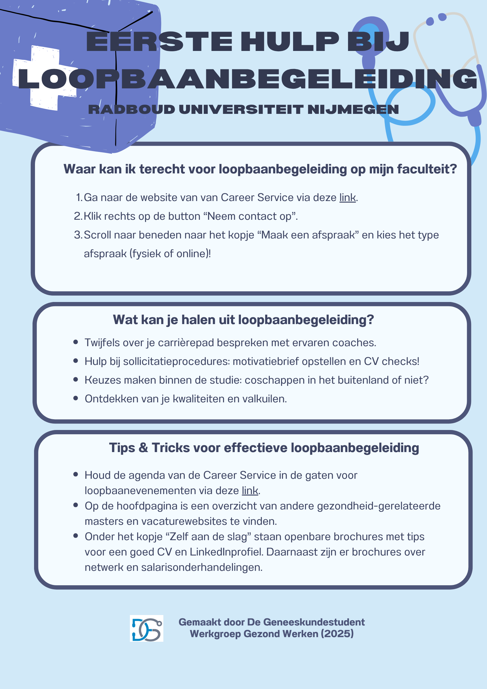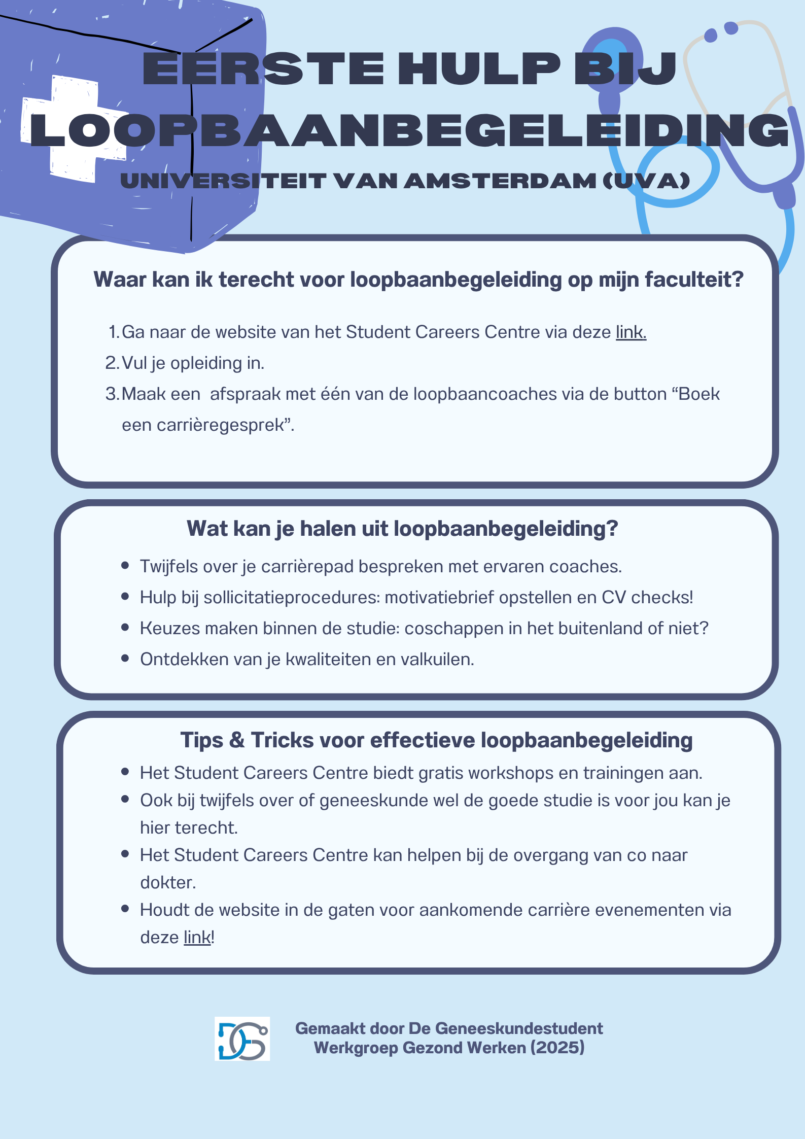 Naslagdocument infographic eigen padEerder onderzoek van De Geneeskundestudent (DG) wees uit dat een kwart van de geneeskundestudenten vaak tot altijd kampt met studiegerelateerde zorgen, bijvoorbeeld omtrent werkdruk en… |